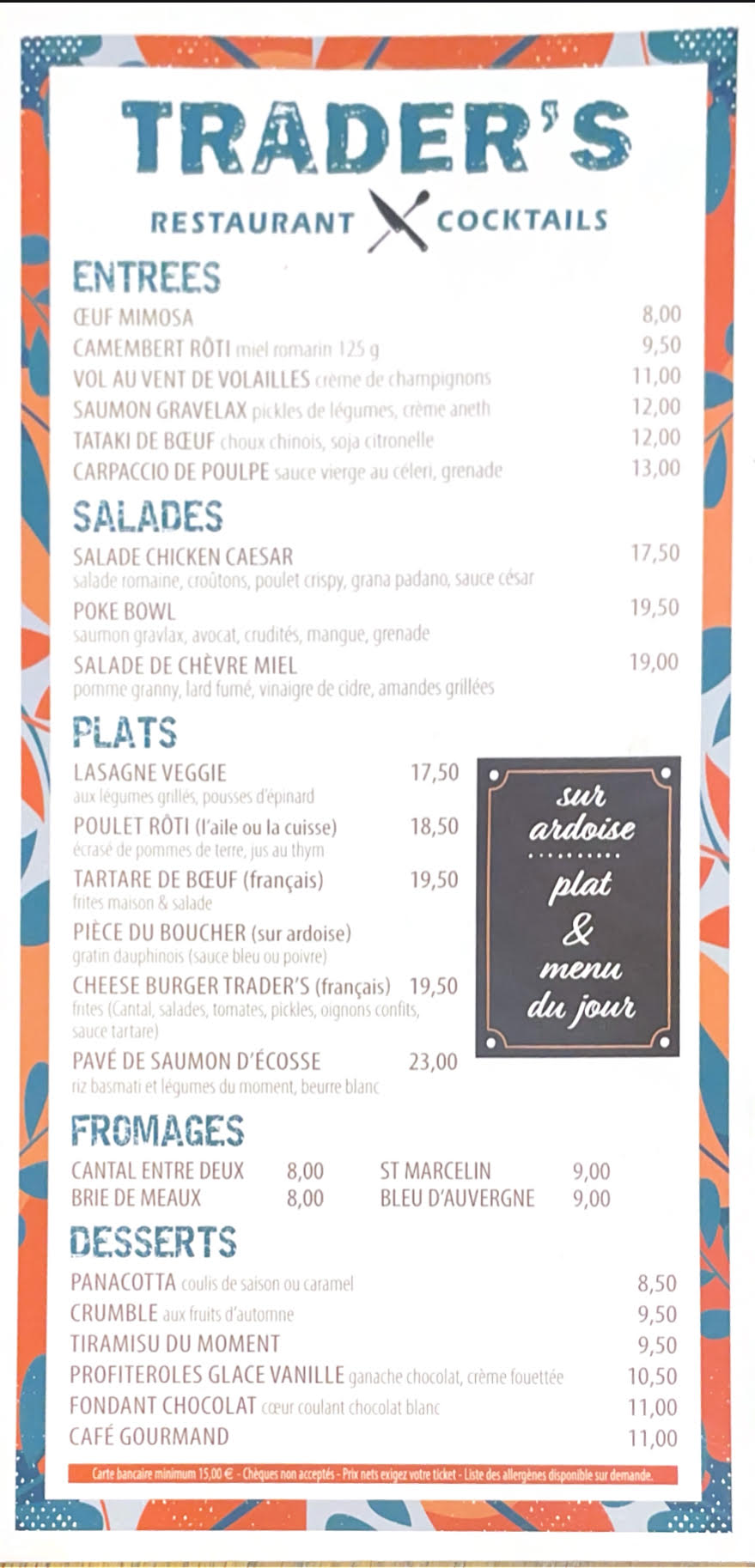 Le soir, même cuisine même équipe ! Mais les cocktails créations du Trader's vous feront apprécier une ambiance chaleureuse et lounge.
